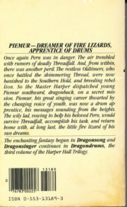 When his boy soprano voice begins to change, Piemur is drafted by Masterharper Robinton to help with political work and is sent on missions that lead him into unusual and sometimes dangerous adventures.