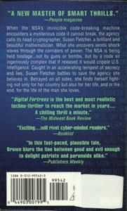 When the NSA's invincible code-breaking machine encounters a mysterious code it cannot break, the agency calls its head cryptographer, Susan Fletcher, a brilliant, beautiful mathematician. What she uncovers sends shock waves through the corridors of power. The NSA is being held hostage--not by guns or bombs -- but by a code so complex that if released would cripple U.S. intelligence. Caught in an accelerating tempest of secrecy and lies, Fletcher battles to save the agency she believes in. Betrayed on all sides, she finds herself fighting not only for her country but for her life, and in the end, for the life of the man she loves.